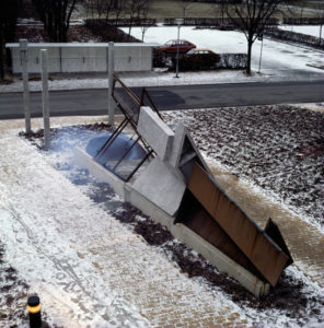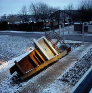 der påkalder sig sin ret til at eksistere i al uforståelighed. Den signalerer sin egen særegne grammatik, og er til fordi den bliver iagttagetog taget i øjesyn og navngivet. En konstruktion i opløsning indtabger sin dramatiske plads i tid og rum.Skulpturen er frembragt af råmaterialer, der i forarbejdtning og sammensætning tilføres flertydigheder.